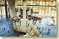 Die kuppelförmige Grotte inmitten der Badelandschaft bietet mit ihrer sphärischen Musik und ihren Farbspielen eine absolute Attraktion. Rutsche, Wildwasserkanal, Massagedüsen, Whirlpool und Saunarium sind weitere Highlight die ein Besuch sicherlich belohnen. |
