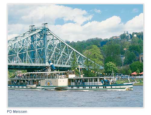 | Zum Beispiel eine Fahrt mit einem historisch rekonstruierten Schaufelraddampfer elbauf- oder elbabwärts. Flussaufwärts führt die Fahrt vorbei an der 240 m über der Elbe thronenden Festung Königstein, hinein ins Elbsandsteingebirge bis nach Böhmen. Flussabwärts entlang der Sächsischen Weinstraße nach Meißen, der historischen Wiege Sachsens. |